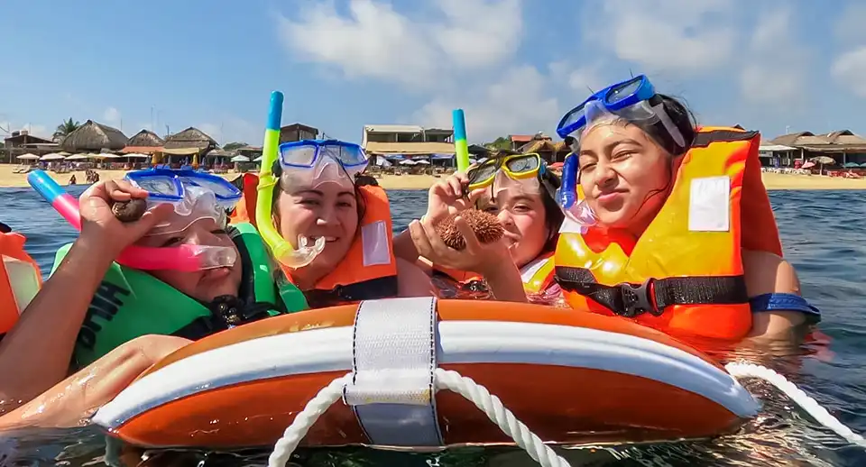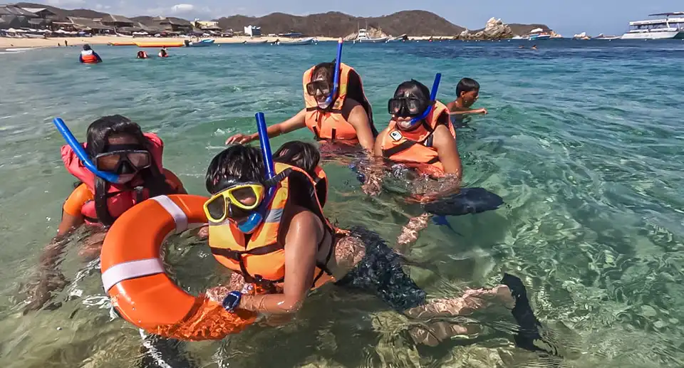 Este tour incluye dos escalas: 🚩 la primera de 45 min a 1 hora en playa Chachacual o la India para realizar la actividad del SNORKEL y poder disfrutar del mundo acuático, ver los bancos de coral y los peces de colores, estrella de mar, erizos rosas y negros; y 🚩 la segunda en Bahía San Agustín para deleitarse con el mejor sazón costeño en el RESTAURANTE MAR Y LUZ