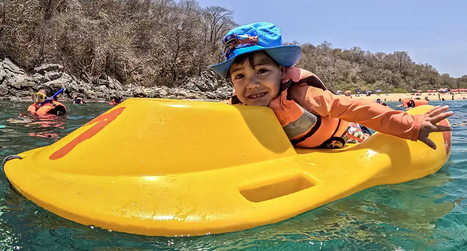 Al llegar a la playa, nos recibirá el equipo del Restaurante Mar y Luz, donde podrás nadar, practicar la actividad del snorkel, deleitarte con una deliciosa piña rellena o alguna de las especialidades del restaurante y relajarte por un lapso aproximado de 4 horas y media; tiempo perfecto en el que esperamos la puesta de sol y nos trasladamos a Playa el Coyote para culminar el recorrido con uno de los mejores atardeceres de Huatulco.